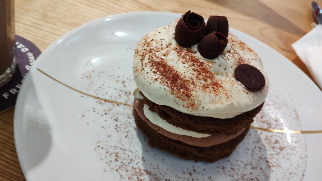 ケーキは絶対にチョコレートのが食べたい。飲み物もチョコレート系にしたら甘々すぎてしんどいかな……と悩みつつ、欲望には勝てなかったセットです。(とはいえカフェモカ系のコーヒーベースのドリンクで折衷案)